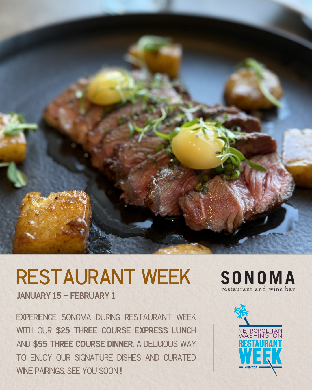 Private Event inquiries are being accepted Monday through Saturday for lunchtime and evening events; please inquire at events@sonomadc.com for availability.
